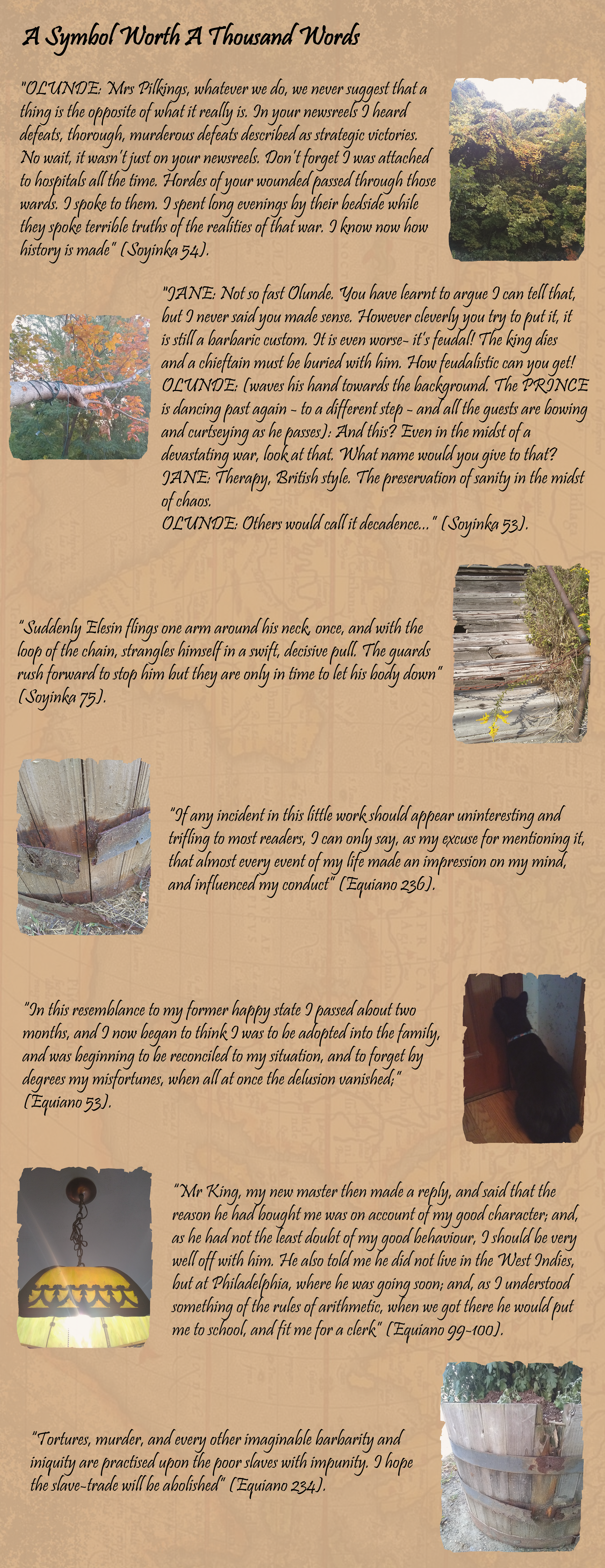 Chains hold a thousand and one meanings and then some. Literal or figurative, we’re held down by chains everywhere. Every person, place, and object needs to be kept in line – in society’s standard of a line. Each society, no, each situation has a different standard of freedom or chains. Equiano was held down by the chains of slavery, Elesin was held down by his people’s beliefs and obligations, and I, as well as many others, are held down by preconceived obligations. Knowing how vastly different chains could be, I gathered numerous photographs – which I took myself – and paired them with quotes. Some of them seem strange, maybe even far-fetched, but bare with me because I have my reasons.