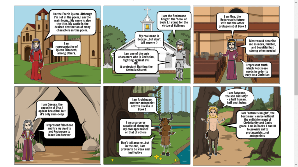 I had SO much fun with this unessay project! I don’t think I would believe myself it I told Freshman year, English major, Delaney that I would be doing a comic strip for a project Senior year. As discussed in my audio reflection, there were a few critical decisions I made within each panel of this comic strip whether purposeful or not. I say that because I used a free software/website called “Storyboard That” and there were some restrictions having to do with background, character design, and how much speech bubbles I could use. It was a fun challenge though, because it made me think just a tad further than I did going into the project. I got a chuckle out of a couple things that I couldn’t do: the Redcrosse Knight doesn’t have a redcross, and Duessa is in front of a cave….There’s a reason 😉 I hope you all enjoy this project, I know I did!