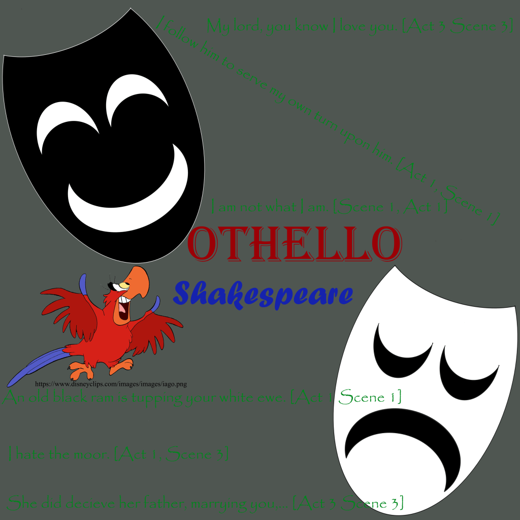 I chose the drama masks to represent Iago’s two-faced nature. The black and white were chosen because of the racial bias Iago shows in regards to Othello. The text is green because jealousy is often associated with green.