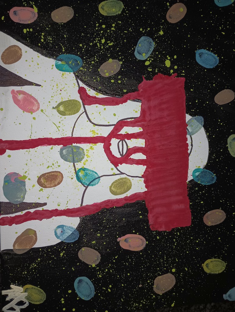 I chose random colors and painted the tip of my pointer finger before pressing my fingertip all over the canvas. I left behind fingerprints all over the canvas because I thought leaving behind actual fingerprints kind of connected to leaving behind a family/legacy and trauma if your family has some, which Ka’s family does. Then I got really interested in who invented finger painting and why it’s so much fun. Turns out modern-day finger painting has only been around since the 1930s when Ruth Faison Shaw “{o}ne day sent a pupil with a scratched finger to the bathroom for some iodine. When he did not return, she investigated and found him, she said, ‘blissfully absorbed in decorating the bathroom door with a finger dipped in iodine.’” (Finger Painting.) Finger painting is also believed to be therapeutic to not only children but adults. So I can only imagine finger painting can help relieve some of the stress about trauma. Now for the real kicker…so what? What does this painting reflect on the literature it is based on? And why does your response to this literature matter? I’ll be honest, I’m still figuring that out. I originally wanted to write a traditional paper but time got the better of me so I decided to do an unessay. I would like to believe that I somewhat grasped the idea of generational trauma in Ka’s family. Throughout the entire novel, I could see Ka’s father dealing and having regrets from his path. Like him or not, he is traumatized by what he’s done and what has happened to him that one night. So I wanted to shed light on how many people are traumatized in this book by the Dew Breaker’s actions and how his/their actions affected those they love intentionally or not.
