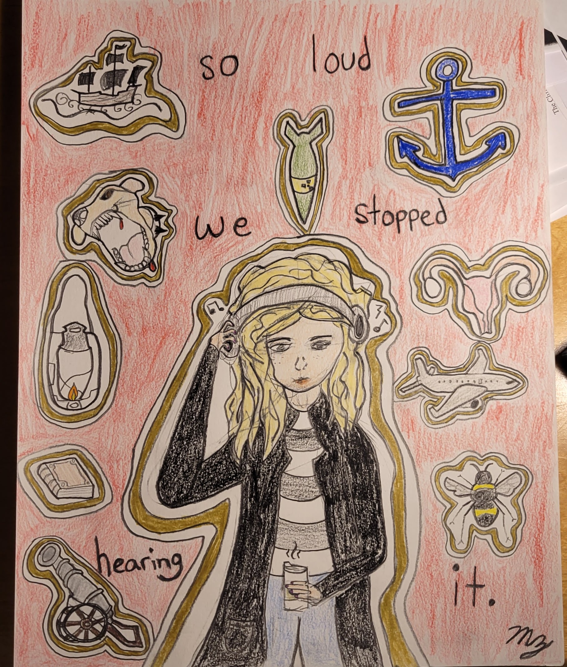 For my Unessay, I read “The World Keeps Ending, and the World Goes On” by Franny Choi. As a response to this, I decided to depict my understanding in a drawing. I drew a picture of a girl, headphones on, coffee in hand, listening to loud music, and not hearing the apocalypse going on around her. The background is red, with the apocalyptic elements behind her, reverberating, and the last few words of the poem are written boldly. The reverberating lines around each element in the drawing made me think of 70’s groovy line art patterns, and I used them to signify how these tragedies happen over and over, cemented throughout history, in one way or another. This history, these mini apocalypses, follow this girl around, follow everyone around, but we are so used to it that we don’t hear it anymore. and the bomb especially, it’s pointed right at her head. We are no longer aware of our doom. I chose to draw a picture for this poem because I like the message. I’ve gotten interested in politics recently so that made me want to bring my interpretation of it to life.