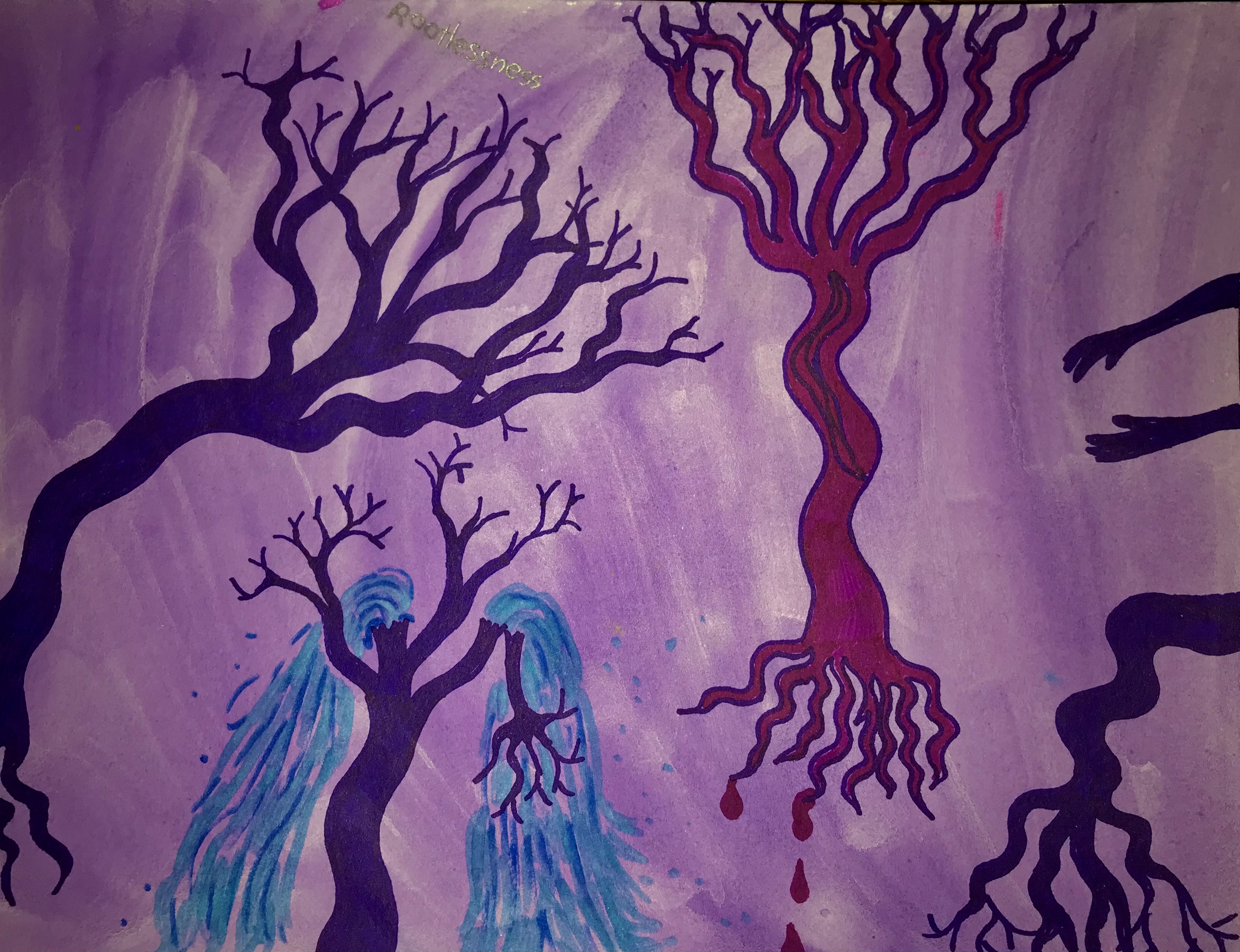 Both Edwidge Danticat’s The Dew Breaker and Wole Soyinka’s Death and the King’s Horseman explore themes of immigration, colonization, cultural identity, and family. In my creative response to these texts, I made an effort to specifically address these themes, while also providing my own interpretation and perspective. My art piece, a 20×22 inch watercolor and ink piece which I have titled “Un/Rooted” features the visual motif of trees. Trees and the idea of “rootedness” are (almost) universally symbolic of connection to family, the earth, culture, and the past. But in both Death and the King’s Horseman and The Dew Breaker, Soyinka and Danticat investigate what happens when people are are disconnected to these things: when cultures are disrupted and threatened by colonization as is seen in the 1940s-era Nigeria of Soyinka’s play when District Officer Simon Pilkings intervenes to prevent an important ritual suicide and subsequently causes an irrevocable and dangerous series of harms against the Yoruba people, or when a daughter of immigrants who already struggles to find a sense of her own rootedness discovers that her father was not the innocent prisoner she made a sculpture of, but instead a torturer or “dew breaker” who worked in a prison during the reign of a brutal dictator.