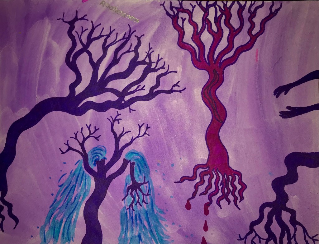 My painting is a mixed media piece that uses mostly watercolors and ink pens. In creating it, I was inspired by the work of Helen R Klebesadel, a watercolor artist and activist whose paintings feature swirly and detailed trees slightly reminiscent of the ones in my piece. Klebesadel believes that her artwork will “creative narratives that re-examine and re-present existing power structures”, a theme that resonants with my intention in creating this artwork.