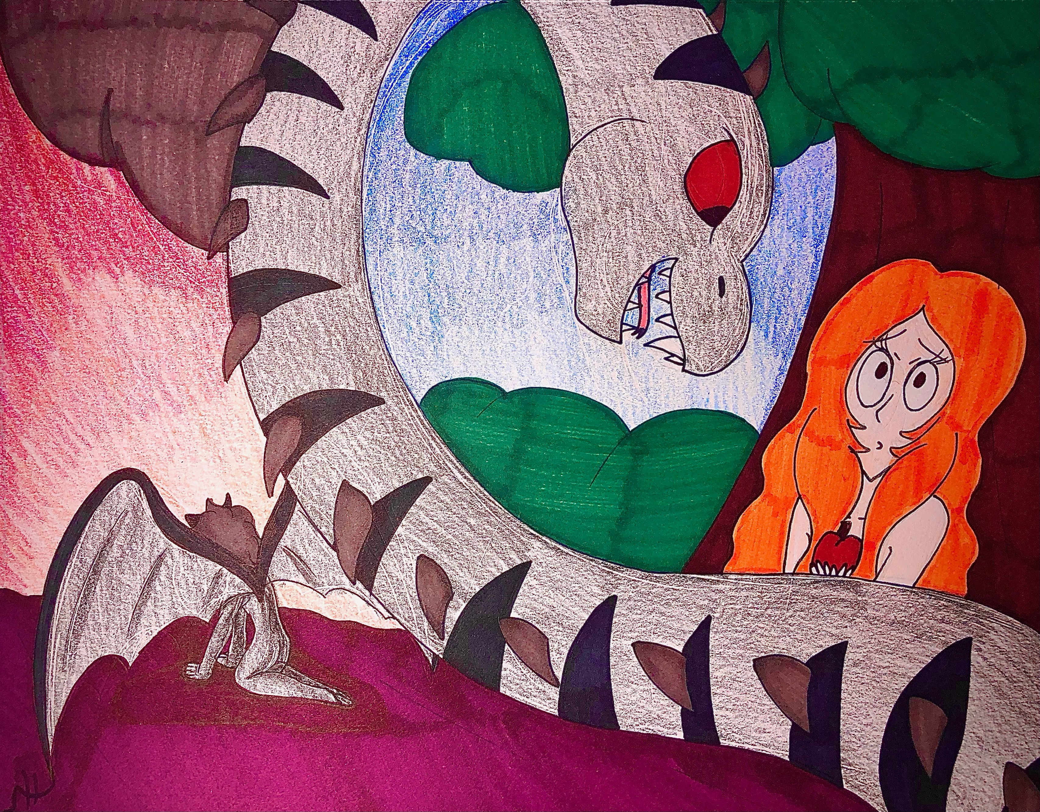 I used two pieces of art below to get an idea of what Satan and Eve traditionally look like based on old paintings, style, and color. The style of the art is cartoonish, but it is my signature art style (any realism I do just looks terrifying). Overall, I am happy with how this piece turned out. It captures the essence of the two sides of Satan, his important moments in Paradise Lost, and how it represents him as a character. While I wish to do a digital version of this someday, I hope the traditional pen and paper aspect captures the true sides of Satan, focusing on him as an understandable villain.