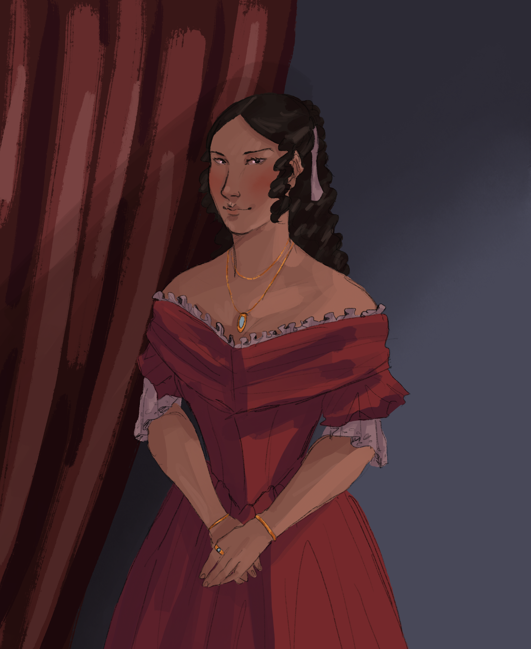 For Blanche’s hair and dress, I had to do a little more research. All we get is a “gold bracelet and diamond ring” (Brontë 187). I looked into what wealthy Victorian women might have worn, and read an article about European, Victorian dresses. It described small waists with intricate dresses and a pronounced bust. I particularly liked the painting on this page, Louise d’Orleans, Queen of the Belgians. While it depicts a French lady, I figured England and France were not too geographically separated and could influence one another. I felt the dress in the painting reflected Blanche’s class. For her “raven ringlets”, I used that same article to see the tight ringlets represented. I personally knew I would struggle to draw them accurately, so I opted for less detailed ringlets.