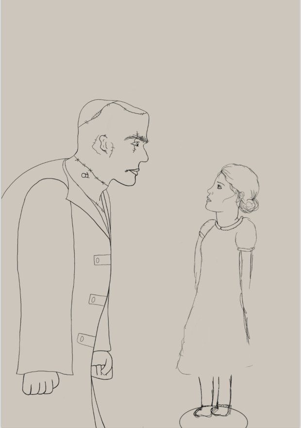 For this project, I chose to do a digital drawing representing both Jane Eyre from Charlotte Bronte’s Jane Eyre and the creature from Mary Shelley’s Frankenstein, 1818 version (photos of said drawing inserted towards the end of this post). Isolation and loneliness are common themes strung deeply throughout the two books, so I thought of connecting those themes with the two characters through visualization. They both experience being outcasted by society, whether it is for only one moment in time or their whole life; neither of them seem to be able to escape it.