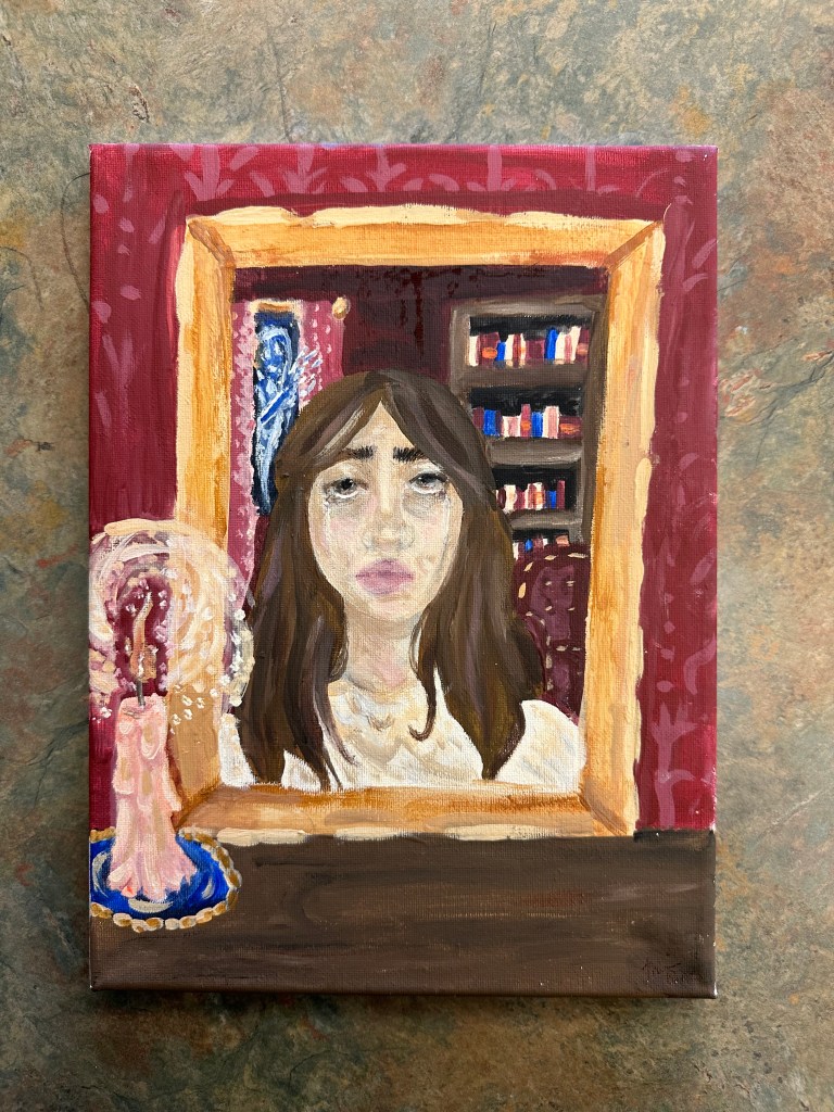 When painting the red room I wanted to add elements from the book while also adding Jane’s perspective of pure fright. The book mentioned the “wardrobe, the toilet-table, the chairs were of deep polished old mahogany” (Ch. 2) . To incorporate the color of the wood into my painting I used the table underneath the mirror to have a slightly red tinted brown color. It dried to be more brown than I had hoped. I also used a similar color to paint the bookshelf. Even though the book never mentioned a bookshelf, I added one to represent a bit of Jane’s character into the painting. The red room was also described to have “an ample cushioned easy-chair” (Ch.2) which is seen as white but I mistakenly painted red. When Jane saw the ghost she “had to cross before the looking glass” (Ch.2) so the angle of the painting is her looking through a mirror seeing the ghost through the window. For the ghost I took some creative liberty by adding the ghost’s boney looking hand coming through the window. The hand is positioned in a way where it looks like it’s pushing back the curtain. I also added some darker red blood dripping from the ceiling near the window to add more supernatural panic from Jane’s mind in that state. I added a candle to add some contrast to the painting. It adds a touch of elegance, as it is a mansion after all.