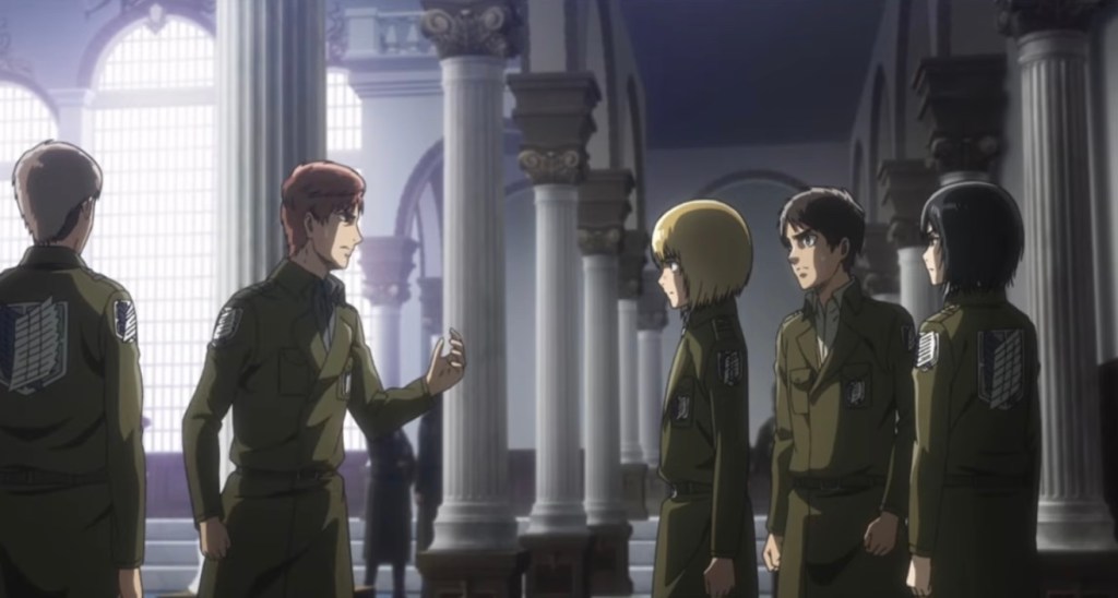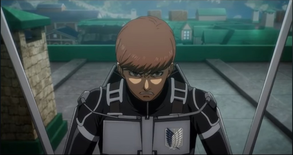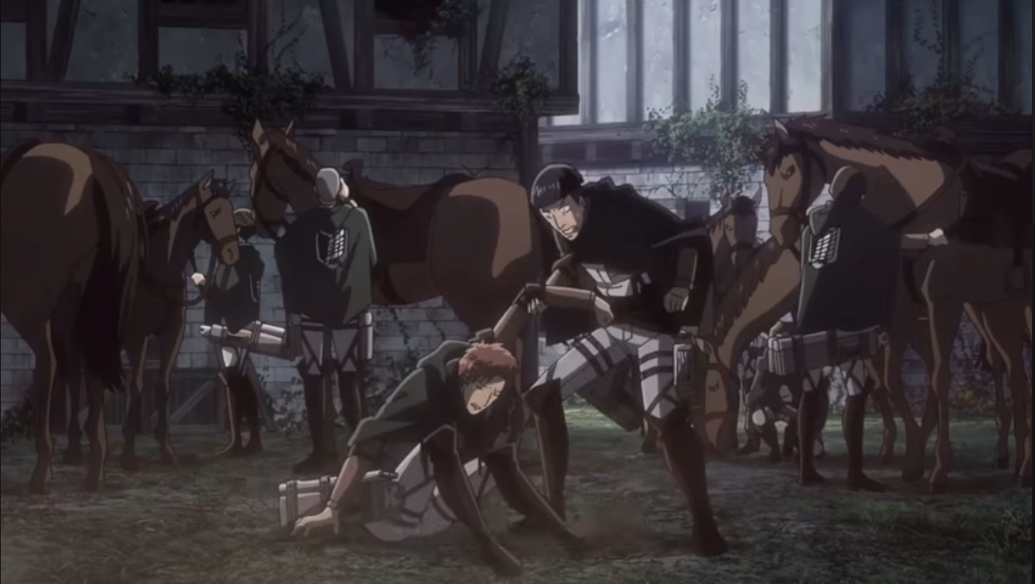 (From ‘Attack on Titan’ Season 3, episode 16, ‘Perfect Game’) Floch is traumatized, and Marlowe chastises him for letting some horses get away.