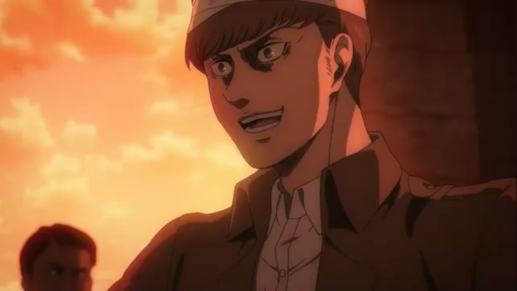 (From ‘Attack on Titan’ Season 4, episode 23, ‘Sunset’) Floch smiling at Jean and Mikasa, telling them that they don’t need to fight anymore, and they’ll finally be free from Marley’s persecution.