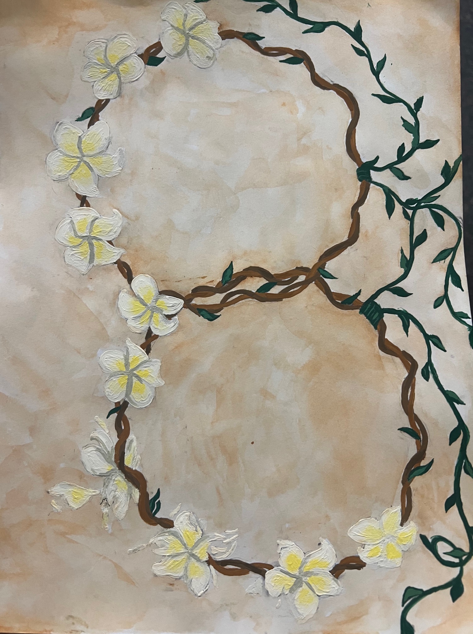Although immortality is a really important symbol of the flower, it is not the only one. While doing more research, I was able to find out more about the meaning of the flower in different cultures, which a lot has to do with things like love, purity, and devotion (Bloomeroo). Furthermore, frangipanis are used in weddings to show loyalty and, on other occasions, to show long love even in times of absence (“About Frangipanis & Plumerias – Facts, History and Myths and Legends.”). I thought these meanings were interesting when looking into the scene where Antoinette and Rochester just showed up for their honeymoon. When they find the frangipani wreaths on the bed, Rochester tries one on and then drops it to the floor and steps on it when he goes to the window, which is the scene I tried to capture with my second painting. When looking at this scene and knowing the meaning behind the flower, it truly shows how their relationship is going to turn out. Antoinette’s, who wants to fall in love with Rochester and arguably does at one point, wreath stays in tack, whereas Rochester’s, who says he never loved her and ends up ruining her life, wreath is crushed. This shows a physical example of Rochester crushing any opportunity to have love and devotion for his wife. It’s a great example of foreshadowing, and on a side note, he’s essentially just stepping on what may be a cultural tradition of hers.