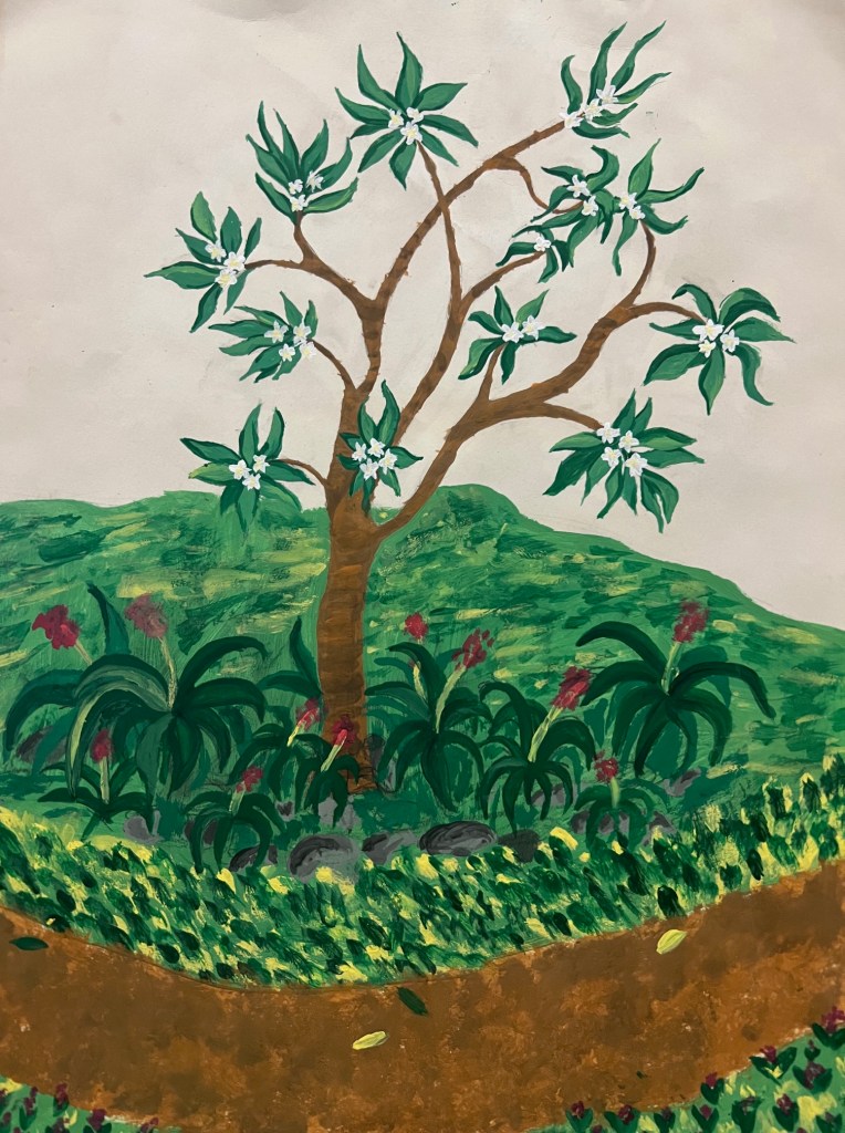In this painting, I painted the frangipani tree in Antoinette’s backyard.