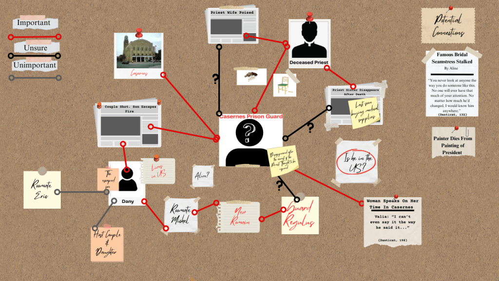 I believe my project is important for many different reasons. The first reason is that it shows how the fat man and Ka’s father are completely different people. Readers are told that the prison guard is Ka’s father. Either characters outright tell us the things the man has done to them, or Ka’s father tells us himself. Sure, there are a few stories that don’t tell us exactly who their abuser was, but most of them do call out Ka’s father. However, if we were looking at this from the perspective of an outsider in the book, someone who has not been directly affected by the fat man, we are likely never to make the connection between Ka’s father and the fat man. This is exactly what I wanted my board to portray. Here, we see that the guard is the center of the board; however, he is technically on there twice. When looking at Dany’s connections, the fake detective might make note that Dany is staying with a host couple, but there is nothing important to note as they seem to be merely a barber and hairdresser. They aren’t important. Thus, I wanted to bring to your attention how, because of the namelessness, it seems like Danticat almost writes the two characters as completely different people.