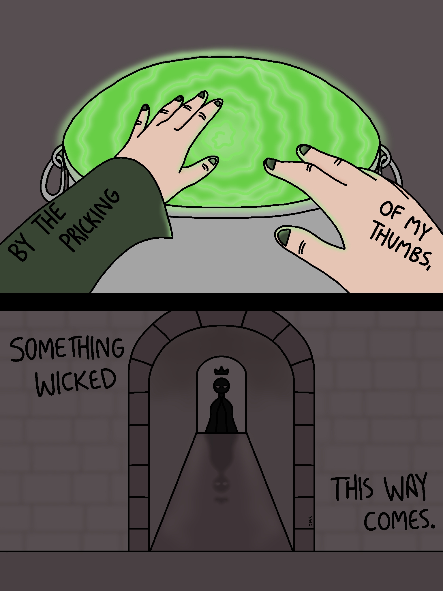 As for the setting, the text never specifies if this scene takes place outside or not. Artistic liberties, yay! What lended me to thinking they are inside is this quote: “Open, locks,/Whoever knocks.” (Macbeth, Act 4 Scene 1) Which seems to allude to the fact that they are somewhere with a locked door. I didn’t actually include a door, as I didn’t want it to take away from Macbeth’s shadowy figure in the doorway. I’m not great at shadows or effects, especially for digital drawings, but I tried my best to make my piece look shaded and for the cauldron to be slightly glowing, as the witches had just finished making a charm/spell.