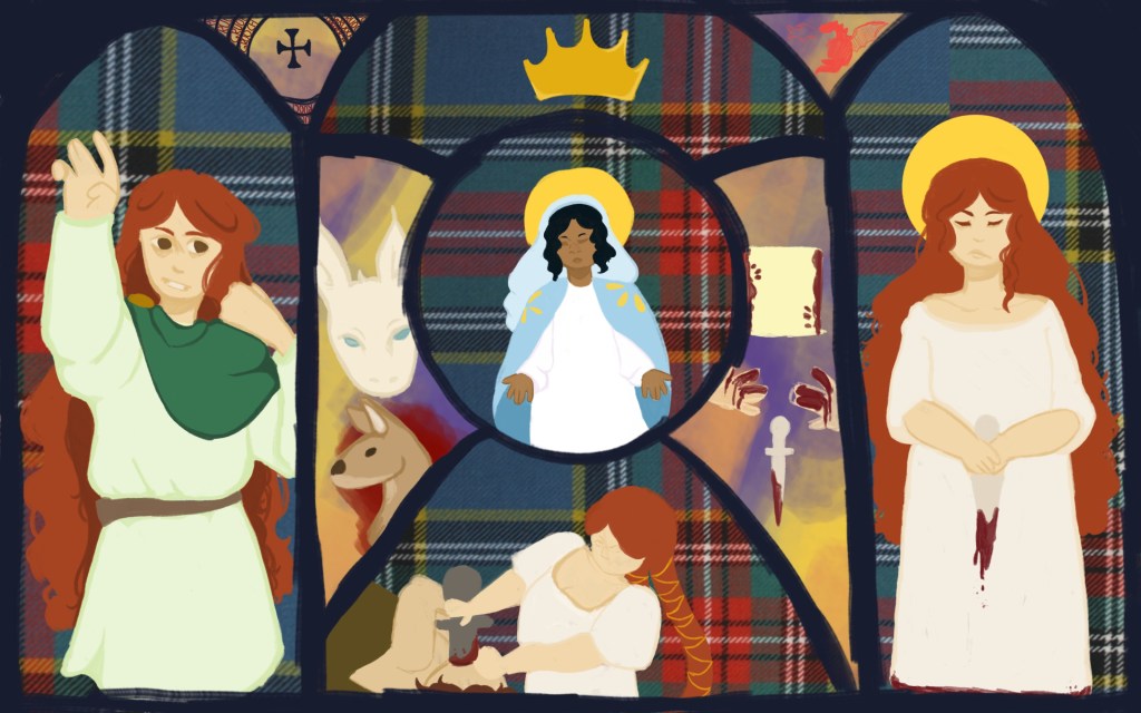 My depiction of Lady Macbeth was based on the painting “Ellen Terry as Lady Macbeth” by John Sargent. The center bottom panel’s hairstyle was directly inspired by the painting, while the other panels with her in them were more inspired by the green and red that stand out so beautifully in the painting (Sargent). The green used in the far left panel has a second meaning, Shakespeare himself used the color green to describe jealousy (Academy of American Poets). And while not outright jealous of her husband she is certainly the more ambitious of the two. There’s only one use of pure white in the entire piece; which is the center panel. While I did not put Lady Macbeth Herself in tartan I did include the MacBeth tartan as part of the background (“Macbeth Tartan”). And through research found that women did wear family tartans in the 1600’s, although there is very little information about women’s dress in the highlands before the 1700’s (MacDonald). Although it is mentioned that womens tartans were generally lighter than the mens versions I used the darker version of the tartan to work in tandem with her wearing mens clothing in one of the panels. Both of which are in reference to the “unsex me” from the play (Shakespeare 1.5.49).