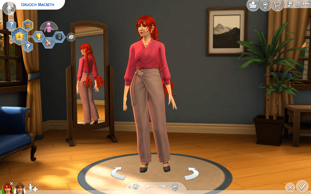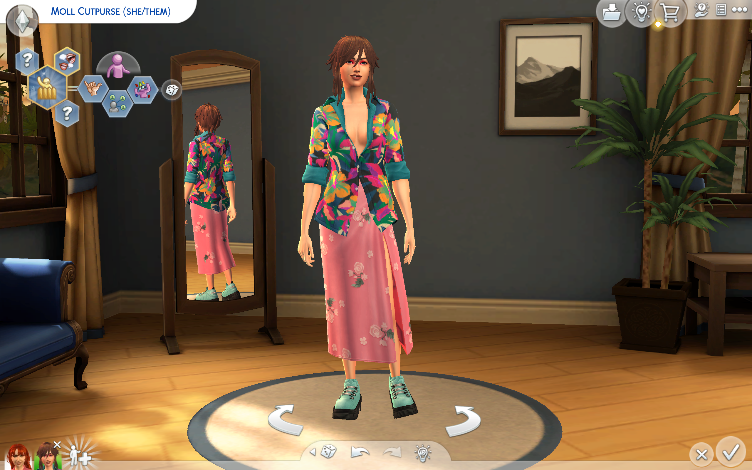 The biggest issue that I had when it came to actually doing this was the issue that the sims 4 has when attempting to put masculine clothing on a feminine frame. It tends to change the frame and body type of the sim, or just look very awkward. Eventually I figured out some outfits for Moll that combined masc and fem clothes; but it was kind of difficult to choose tops that didn’t randomly alter their body.