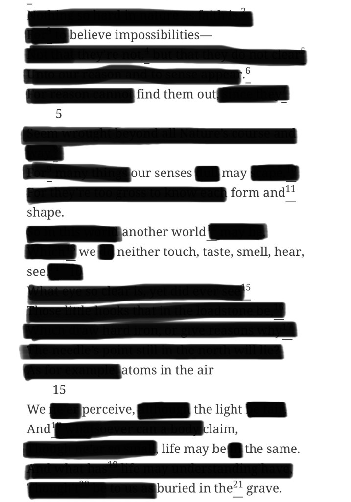 When I was going through Margaret Cavendish’s poem to make my own blackout poem, I wasn’t sure at first what I was looking for. I ended up just picking the words/phrases that flowed the best and by the end of it I really liked how it turned out. To further explore this: This blackout poem further touches upon Cavendish’s idea that reality reaches beyond what the senses can detect. I kept Cavendish’s curious tone, however my poem is more hopeful and investigative. I focus more on urging the reader to go out and seek things rather than Cavendish’s take of pushing the reader to think. I took it from questioning to more direct statements. Below is a line by line analysis of my blackout poem.