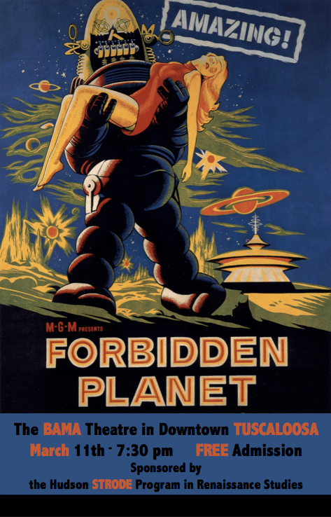 Join us this Wednesday, March 11th at 7:30pm in Tuscaloosa’s Bama Theatre for Forbidden Planet! If you consider yourself a film or science fiction geek and haven’t seen Forbidden Planet before, consider this Wednesday your chance to get right with the world before your geek license is revoked. This movie sets up so many tropes that will come toContinue reading “Forbidden Planet, Wednesday!”